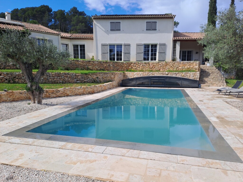 On the ground floor, two large bay windows open onto two shaded terraces leading to a 12 x 5 x 1.45 mirror pool shaded by 2 centuries-old olive trees. The pool is covered by a shelter to enjoy it as late in the season as possible, and connected to the house’s reversible heat pump for winter heating.