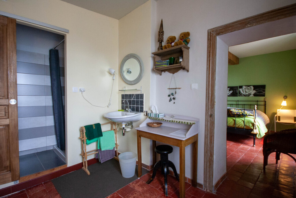 Étage : 3 grandes chambres d’hôtes, chacune avec salle de bain et sanitaires privatifs, dont une chambre familiale.