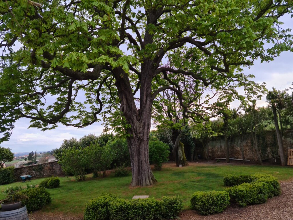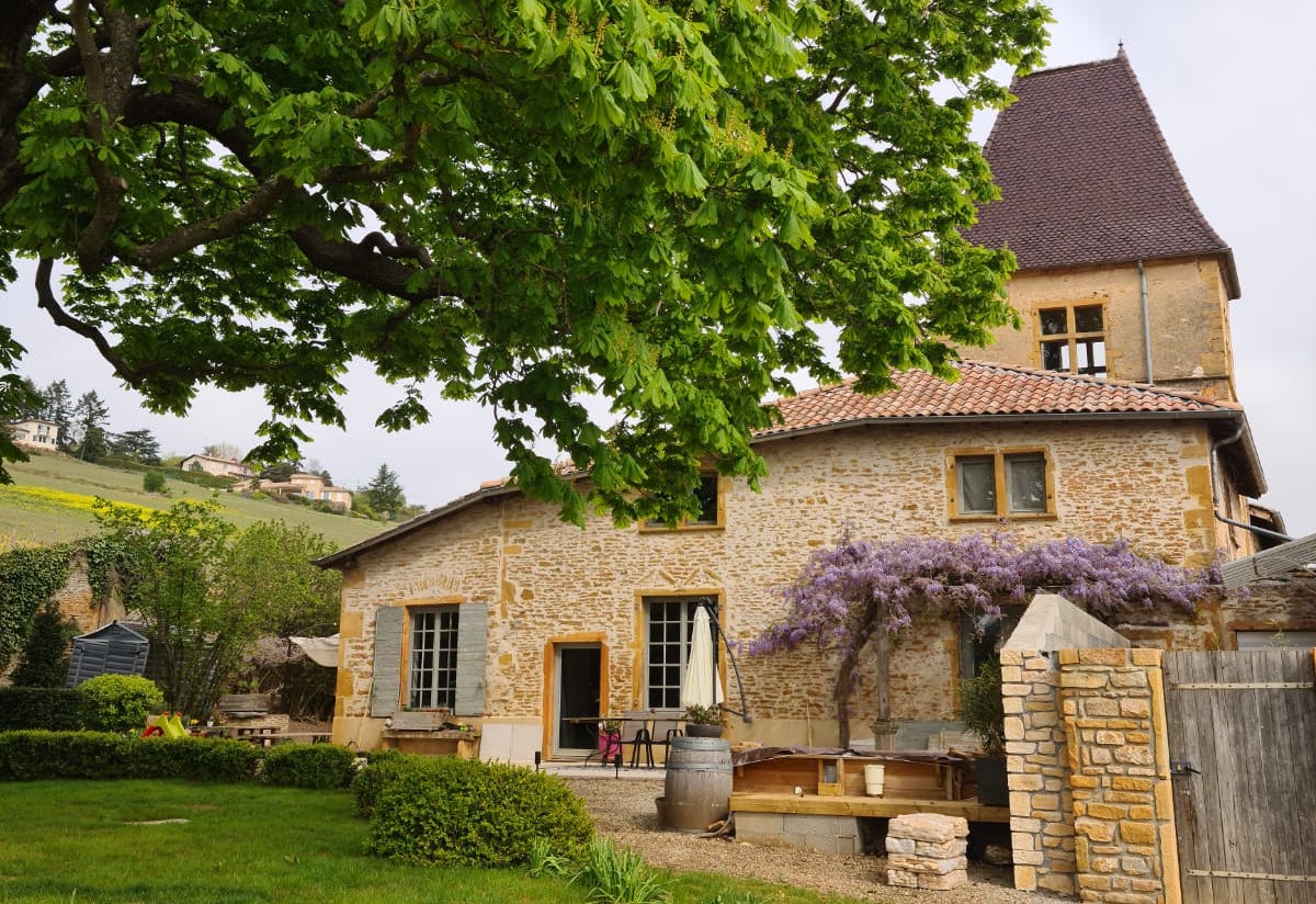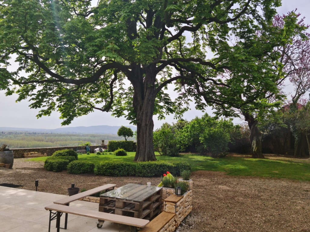 Le jardin d’environ 700 m² bénéficie d’une vue dégagée sur les monts du Beaujolais, la Saône et, par temps clair, le Mont Blanc, notamment au lever du soleil. Un léger bruit de fond peut être perceptible en raison d’infrastructures à proximité.