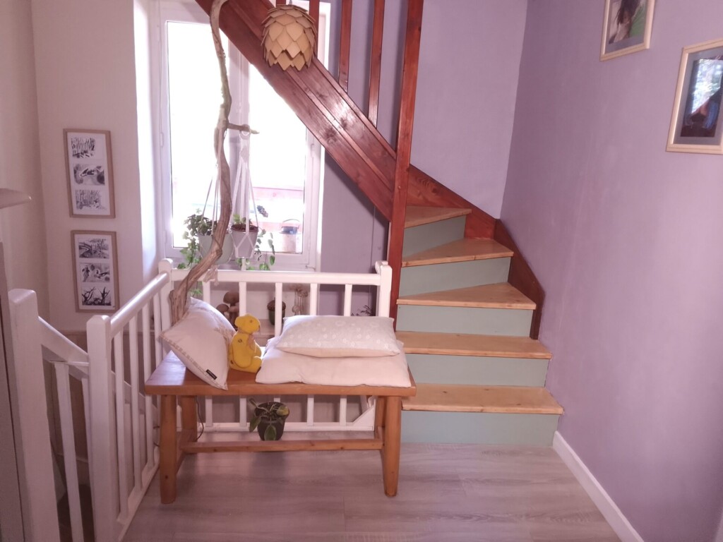 Depuis le palier, un second escalier mène au deuxième étage. On y découvre une troisième chambre sous pente de 18 m2 habitables (25 m2 au sol), bénéficiant d’une belle hauteur sous plafond et équipée de placards, une quatrième chambre sous pente de 14 m2 habitables (15 m2 au sol), disposant d’une belle luminosité grâce à sa fenêtre et son Velux et une salle de bain avec douche et WC, éclairée par un Velux.