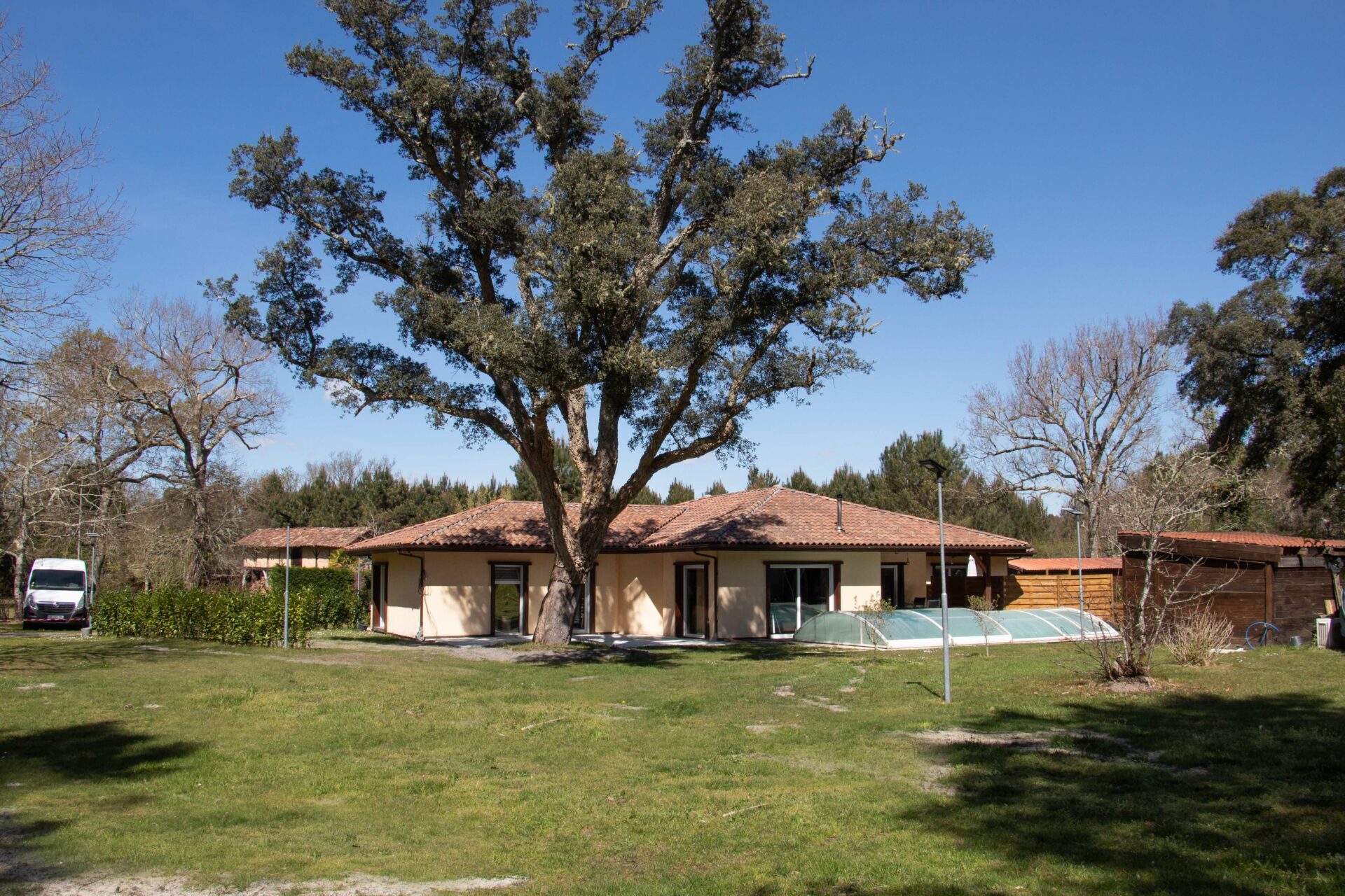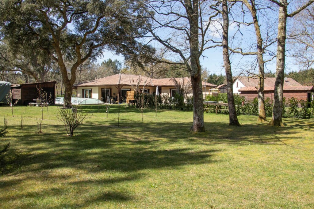 Accédons à la terrasse ombragée où l’on peut profiter du plein air toute l’année. La piscine chauffée de 4 x 8 mètres attire immédiatement le regard, mais le jardin est tout aussi remarquable. On se retrouve dans un vaste jardin planté de magnifiques chênes-lièges, de pins et d’arbres fruitiers qui offrent ombre et fraîcheur en été et peuvent donner une abondante récolte. Pour les passionnés de jardinage, l’espace est exceptionnel : il y a largement de quoi créer un véritable potager ou élever des animaux. Imaginez cultiver vos propres légumes et herbes aromatiques, à deux pas de la cuisine. Une véritable liberté pour les amoureux de la nature.