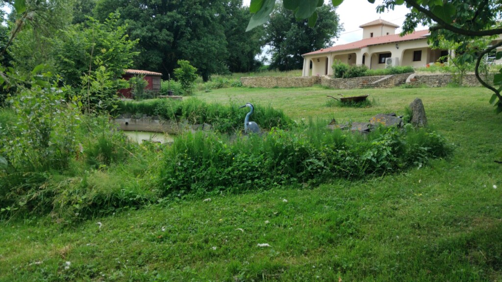 Le jardin comporte des arbres fruitiers, des vignes et de nombreux arbres de toutes variétés et descend jusqu’à une rivière où l’on peut pêcher sans permis. Il y a des marches qui mènent à la rivière où l’on peut amarrer un bateau. Il y a aussi une piscine naturelle de 30m2 (15 x 2) remplie par l’eau d’un puits naturel, et une petite cascade électrique.
